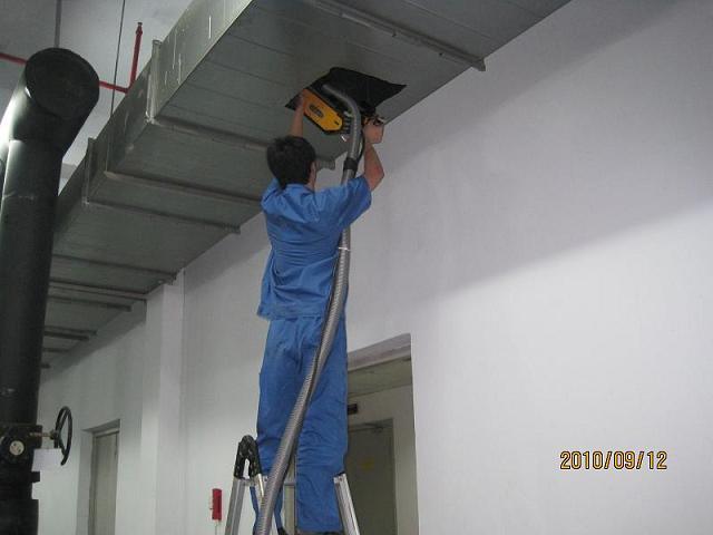 清洗目的 中空調系統(tǒng)風管內塵埃堆積,風管內部的溫濕度環(huán)境促使大量的細菌、微生物滋生,適宜某些細菌的生長和繁殖,形成傳染病源,從而使空調系統(tǒng)不能提供良好質量的空氣。而且風管中大量堆積灰塵,會導致風阻加大,增加風管系統(tǒng)阻力,使空調系統(tǒng)的風量下降,機組能力下降,損耗能源。 工藝技術 了解新風管、回風管、送風管系統(tǒng)的布局,選定吸塵風口和清洗風口,使用通風管監(jiān)視監(jiān)控系統(tǒng)檢查管道內污染程度、管道結構內特點,選擇合適的清洗設備,阻斷系統(tǒng)放入不清洗的風管中一端,以便充分隔離清洗區(qū)和非清洗區(qū),避免二次污染。監(jiān)視系統(tǒng)對風管清洗前、中、后進行監(jiān)測及錄像保存。 風管清洗三大方法與基本操作流程 一、機器人清洗法(適合于鍍鋅鋼板、玻璃鋼、酚醛等非金屬材質風管) 拆除各種風口 → 專業(yè)單位測定風管內積塵情況 → 放入檢查機器人 → 觀察風管內部情況,確定清洗方案(可制作光盤) → 在需清洗的風管二頭放置二個氣囊并于其中一邊開一個圓形工藝孔(或利用原有出風口),并把該孔與捕集器的吸入口用軟管聯(lián)接 → 再從另一口內(或利用原有出風口)放入清掃機人邊走邊打松灰塵由捕集器同時把灰塵吸走即“楊塵吸塵法“(適合中、小型風管)。{或先放入清掃機器人打松積塵 → 然后再放入吸塵機器人吸走灰塵“直接吸塵法”(適合大、中型風管)} → 放入噴霧消毒機器人噴灑消毒劑 → 放入檢查機器人觀察風管清洗后情況(可制作光盤) → 專業(yè)單位測定風管清洗后情況 → 安裝各種風口 → 出具清洗完工報告。 二、軟軸清洗法(適合于鍍鋅鋼板、玻璃鋼、酚醛等非金屬材質風管和超級風管) 拆除各種風口 →專業(yè)單位測定風管內積塵情況 →放入軟軸檢查頭→觀察風管內部情況,確定清洗方案(可制作光盤)→在需清洗的風管二頭放 置二個氣囊并于其中一邊開一個圓形工藝孔,并把該孔與捕集器的吸入口用 軟管聯(lián)接 →再在另一邊放入清掃軟軸機邊推邊打松灰塵由捕集器同時把 灰塵吸走即“楊塵吸塵法”(或通過和專用高壓吸塵器同時工作可實現(xiàn)對上述風管的清洗與吸塵同步完成“直接吸塵法”) →放入噴霧消毒軟軸機噴灑消毒劑 →放入軟軸檢查頭觀察風管清洗后情況(可制作光盤)→專業(yè)單位測定風管清洗后情況 →安裝各種風口→出具清洗完工報告。 三、風刀與振動鞭清洗法(適合于鍍鋅鋼板、玻璃鋼、酚醛等非金屬材質風管和超級風管)